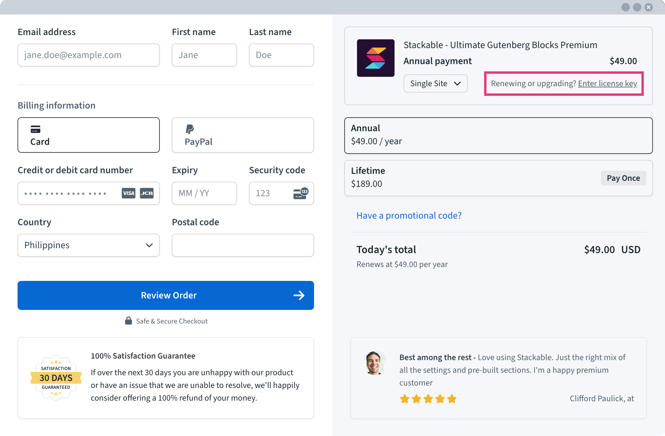 - Before checking out click the Renewing or upgrading a license? then enter your current License Key.