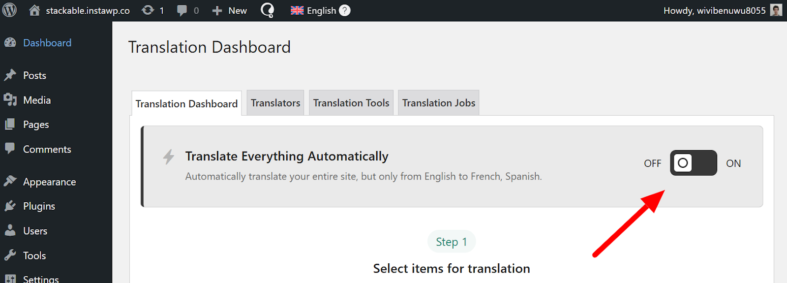 Once you’re comfortable using WPML, you can translate your entire website automatically with one click. To do this, simply enable WPML’s Translate Everything Automatically feature at the top of Translation Dashboard.