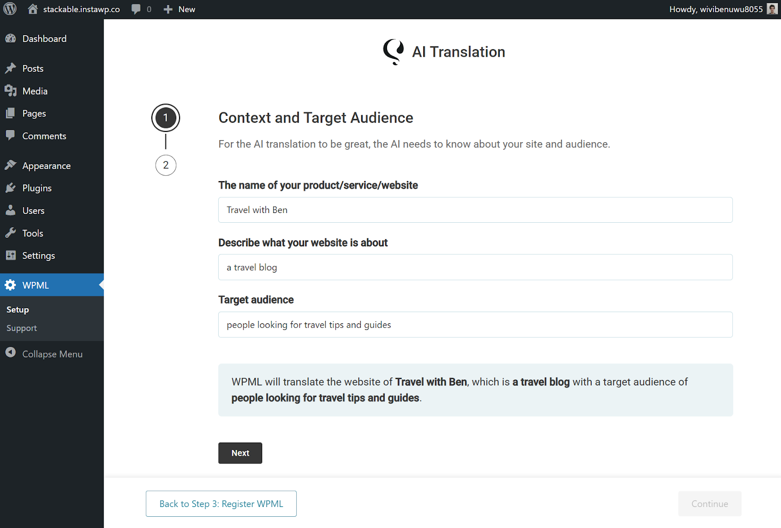 To begin, start by installing and activating the WPML plugin. Once installed, complete the WPML Setup Wizard, where you can choose target languages, a URL format for translations, and provide context to help WPML create better translations.